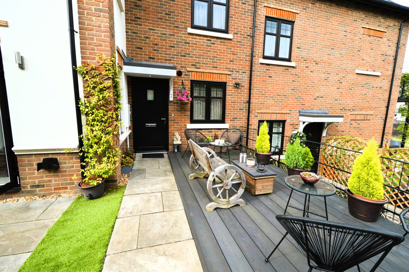 PRIVATE FRONT GARDENS: Attractive patio area leading to attractive artificial lawn, raised decking area ideal for entertaining and BBQs, outside water tap, gas meter.
