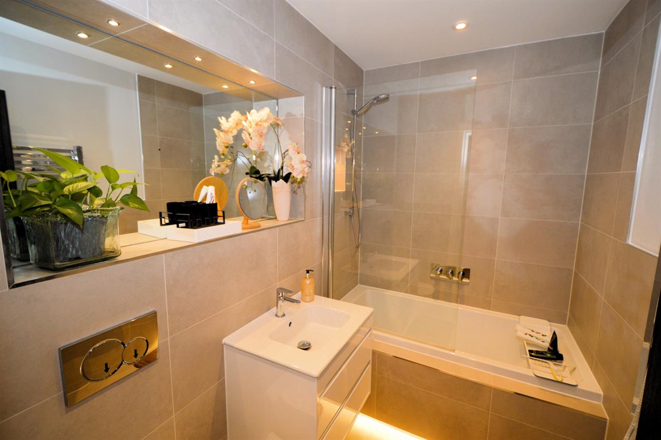 BATHROOM: A luxury white suite with low level WC, wash basin with vanity, recessed mirror with LED lights, dual sensory lights, panel enclosed bath with shower screen and wall mounted shower, towel heater.
