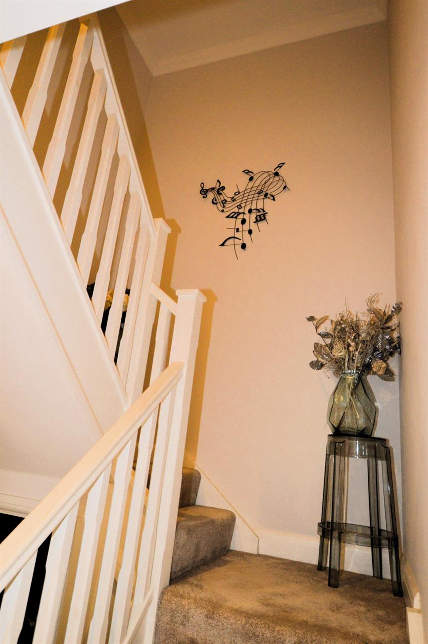 Attractive front door to the: SPACIOUS ENTRANCE HALL: Wood laminate flooring, cupboard with wall mounted gas fired Potterton combination boiler for heating and hot water, ground floor thermostat, radiator, deep under stairs storage cupboard, utility area with worktop, cupboard and washer drying, electric fuse box.