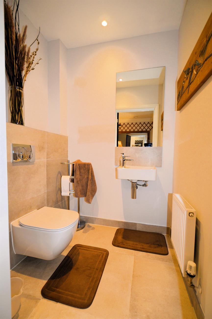 CLOAKROOM: Low level WC, wash hand basin with mixer tap, mirror, attractive tiled flooring.