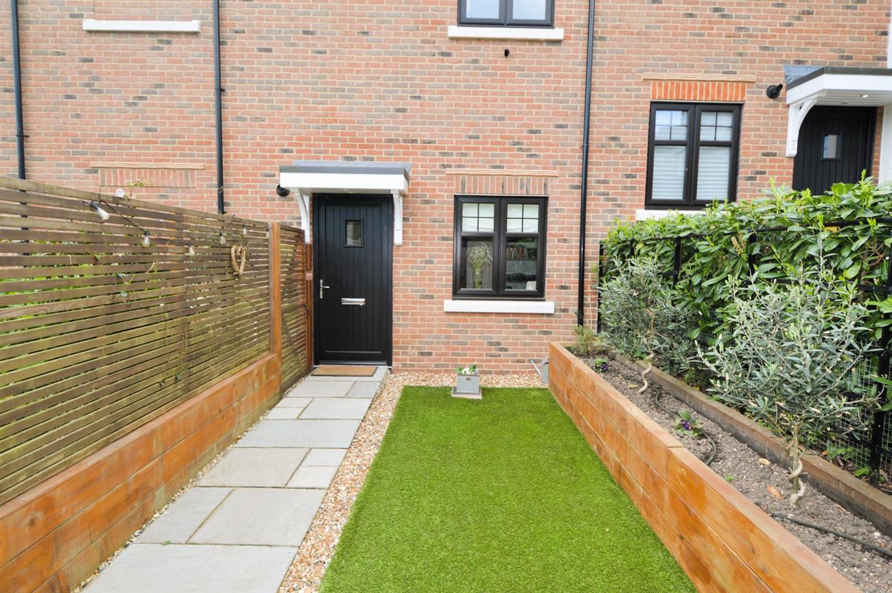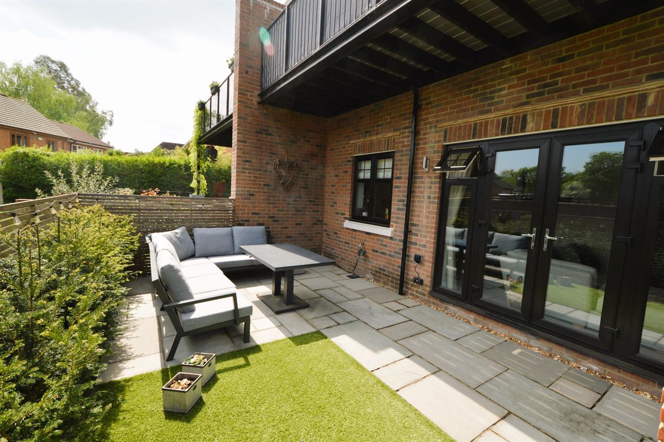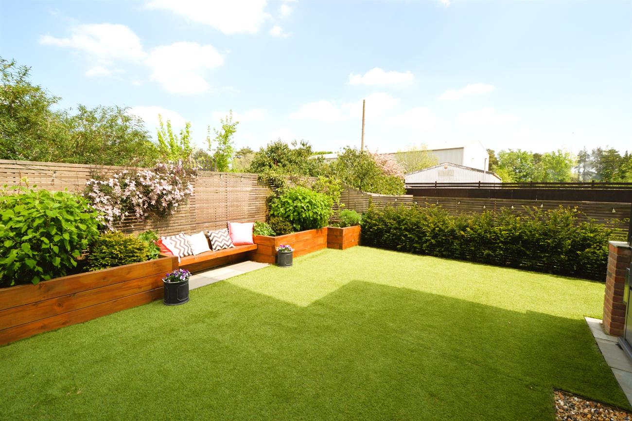 PRIVATE MODERN DESIGN REAR GARDEN: Patio area ideal for entertaining and BBQs, leading to attractive artificial lawn, raised flower and shrub borders with railway sleepers, outside water tap, power points, side gate.