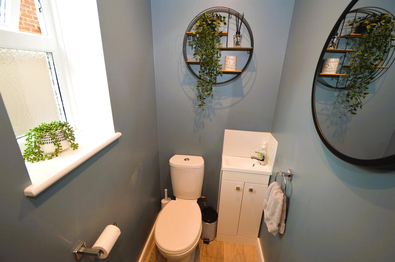 CLOAKROOM: Low level WC, wash basin, double glazed side window, radiator, down lights, continuation of wood laminate flooring.