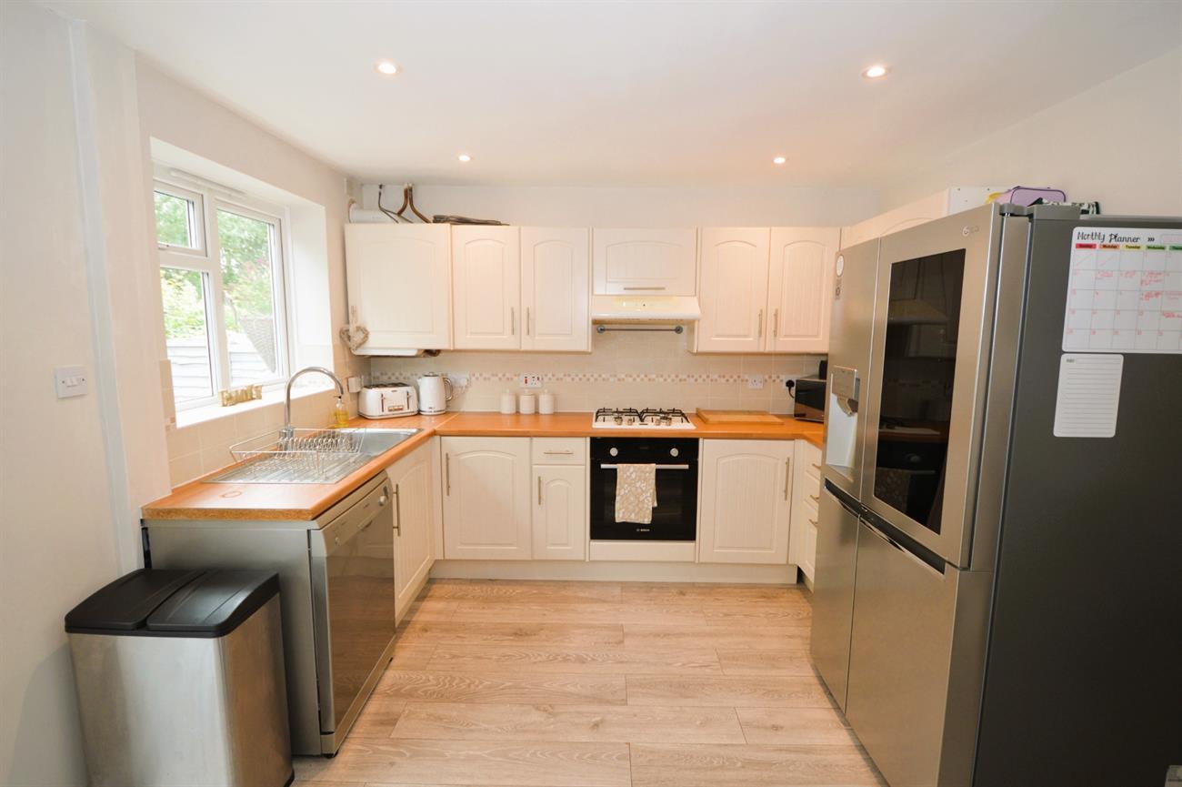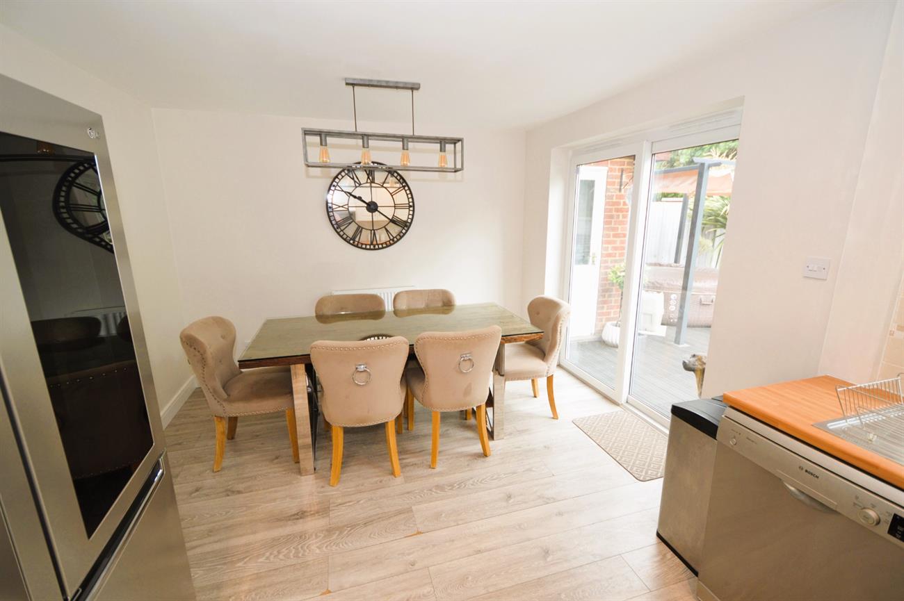 OPEN PLAN KITCHEN/DINING ROOM: 15’6 x 10’6 (4.73m x 3.20m). Wood laminate flooring, kitchen area with base and wall cupboards, tiled splash backs, double glazed window, stainless steel sink unit with mixer tap, built-in Bosch oven, Stoves four ring gas hob, cooker hood above, space for a large fridge/freezer, room for dishwasher, down lights, wall mounted Worcester Bosch Greenstar system boiler for heating and hot water. Dining Area with radiator, modern ceiling lights, double glazed sliding patio door.