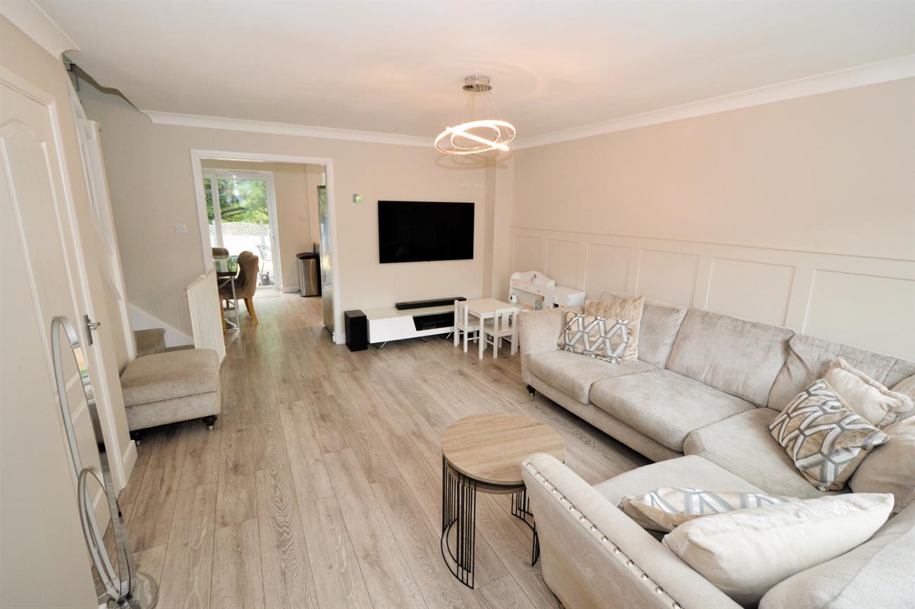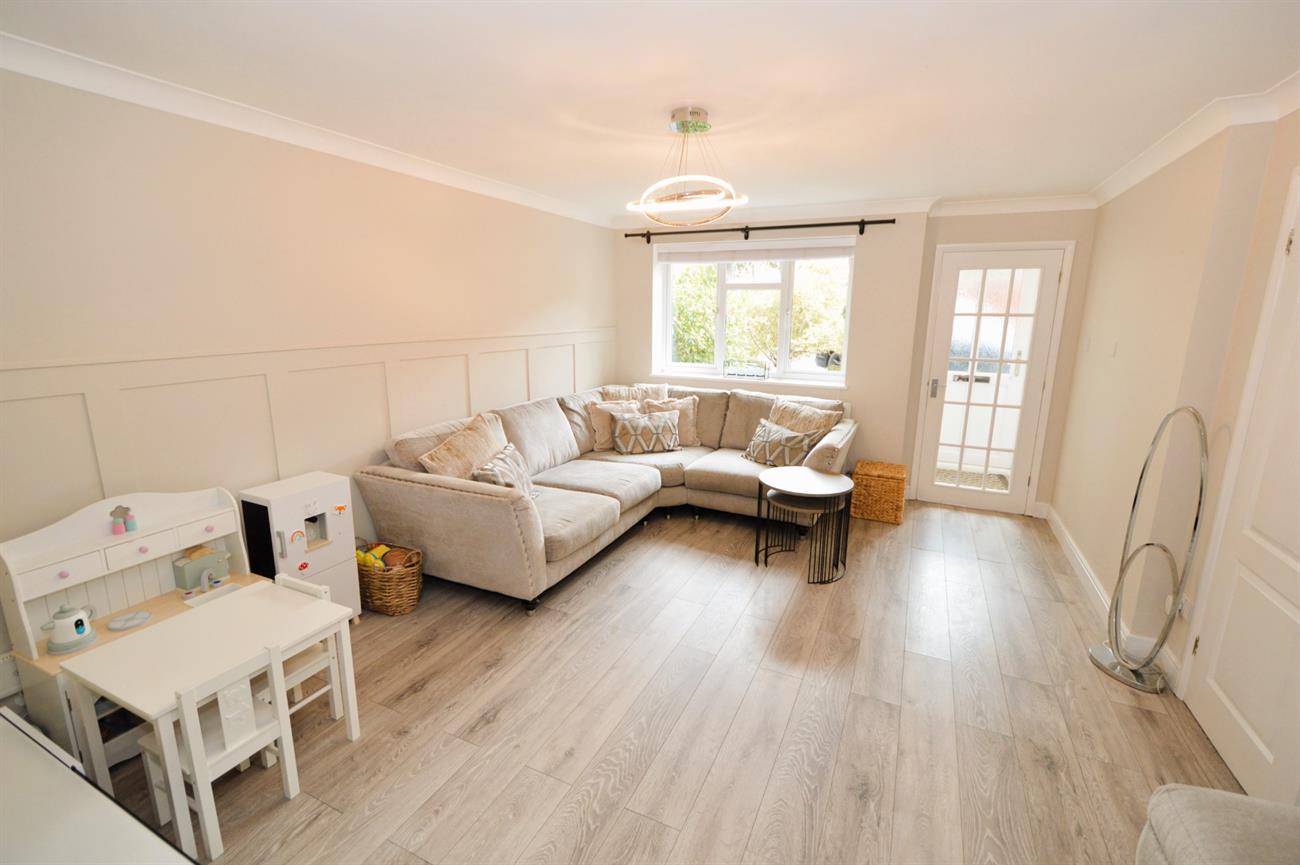 LIVING ROOM: 15’6 x 12’7 (4.72m x 3.84m) Glazed door from entrance hall, continuation of the wood laminate flooring, radiator, front aspect double glazed window, under stairs storage cupboard with fuse box, archway to: