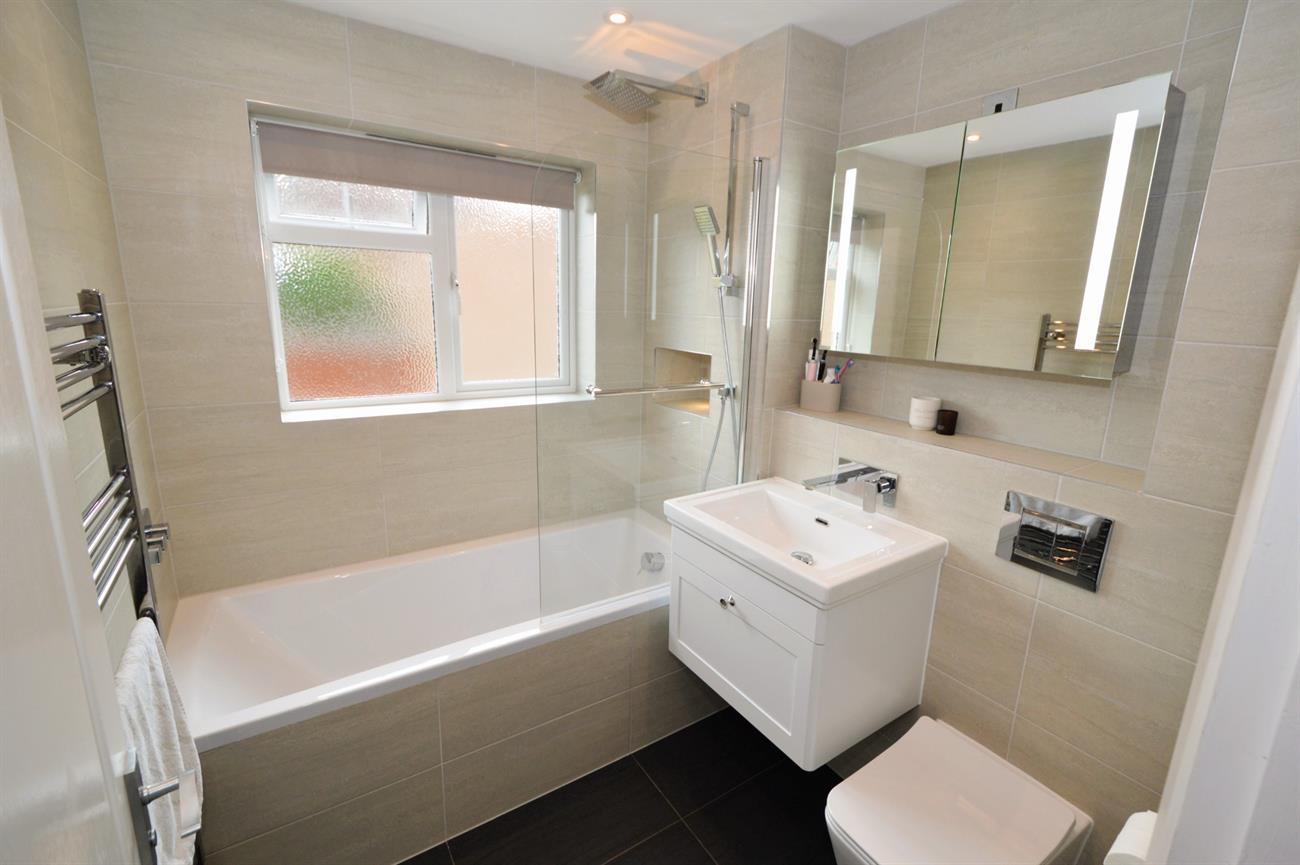 LUXURY BATHROOM: Double glazed window, attractive fully tiled walls, wall mounted wash basin, mirror cabinet with light, shaver point and Bluetooth speakers, low level WC, panel enclosed bath with shower screen, niche with light, wall mounted shower unit, towel radiator, tiled flooring, plain ceiling with down lights.