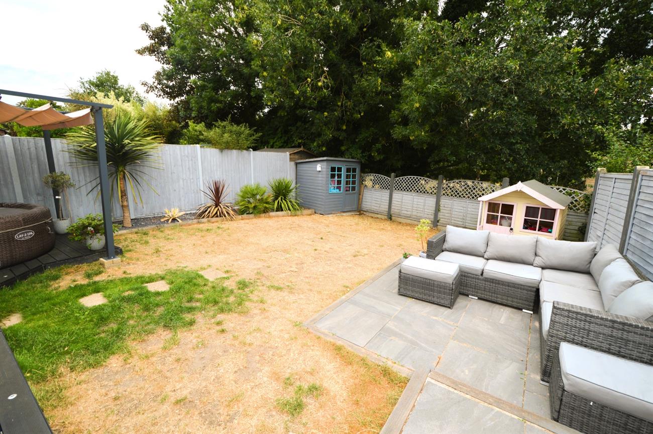 REAR GARDEN: Raised decking area leading to lawn, raised flower and shrub border with railway sleepers, further raised patio area ideal for entertaining and BBQs, timber storage shed, outside water tap, side access with gate.