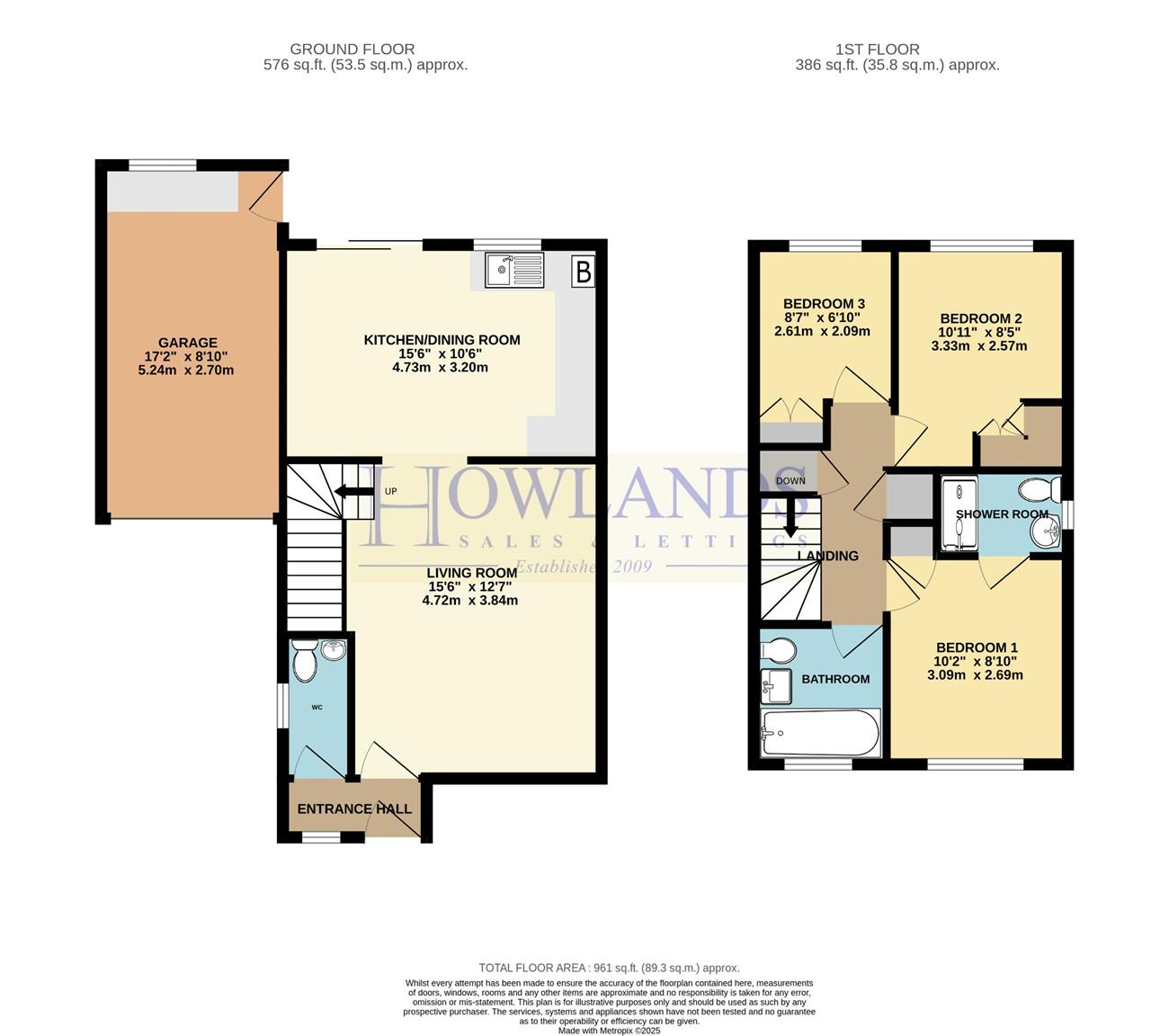 GARAGE: 17’2 x 8’10 (5.24m x 2.70m). Up and over door, rear door, space for tumble dryer, window.
