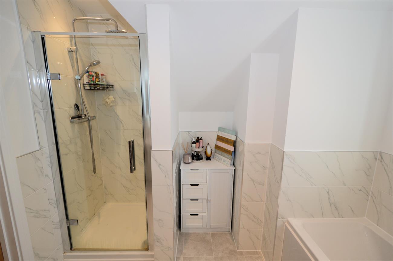 LUXURY BATHROOM: A Roca white suite bathroom with panel enclosed bath with hand shower, double glazed window, low level WC, wall mounted wash hand basin, mirror with light, down lights, shower cubicle with wall mounted shower unit, fully tiled to shower area, half tiled to remaining walls, attractive tiled flooring.