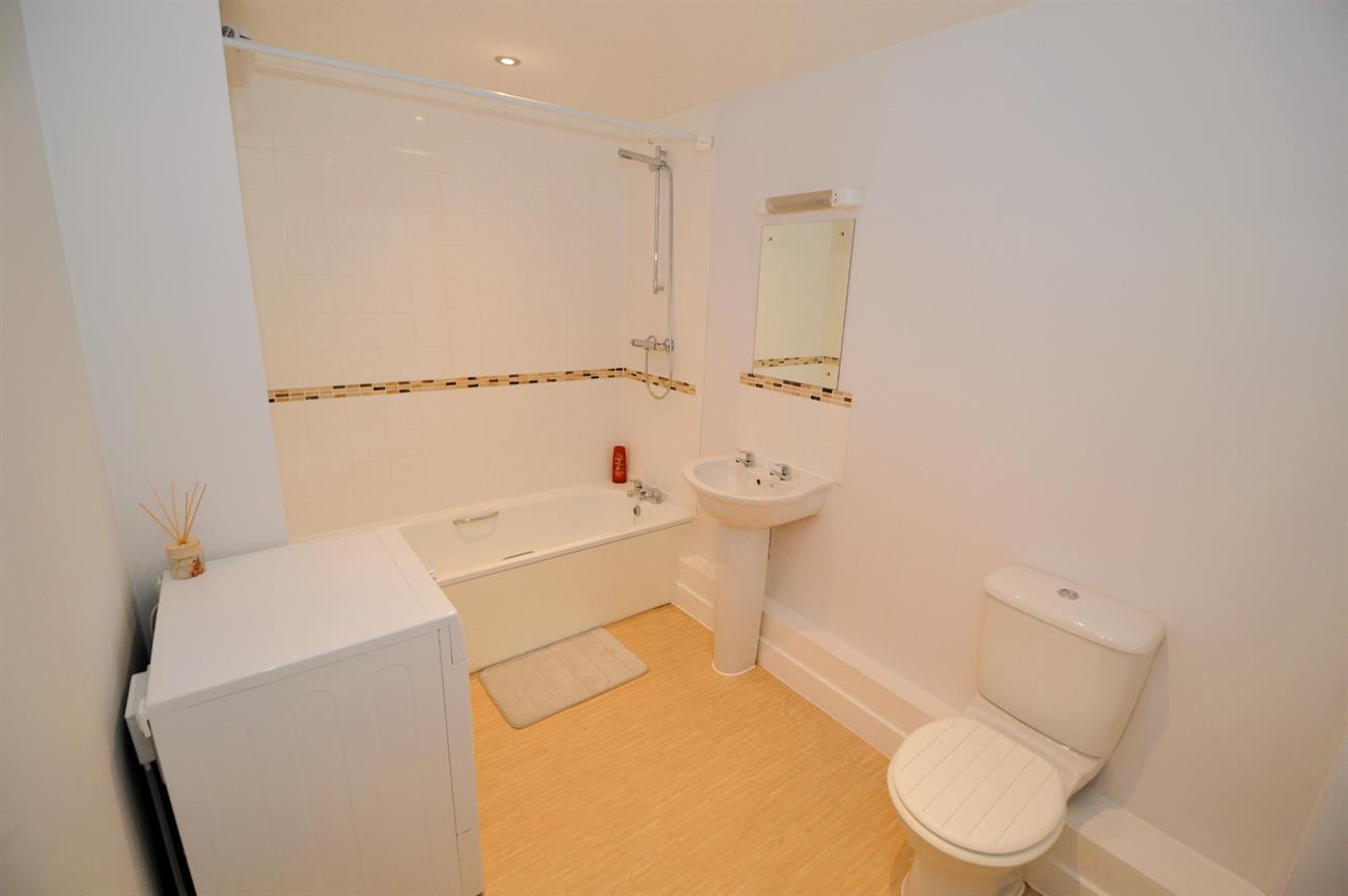 BATHROOM: A white suite with low level WC, wash hand basin, panel enclosed bath with wall mounted shower on a riser bar, tiled to bath area, radiator, electric shaver point.