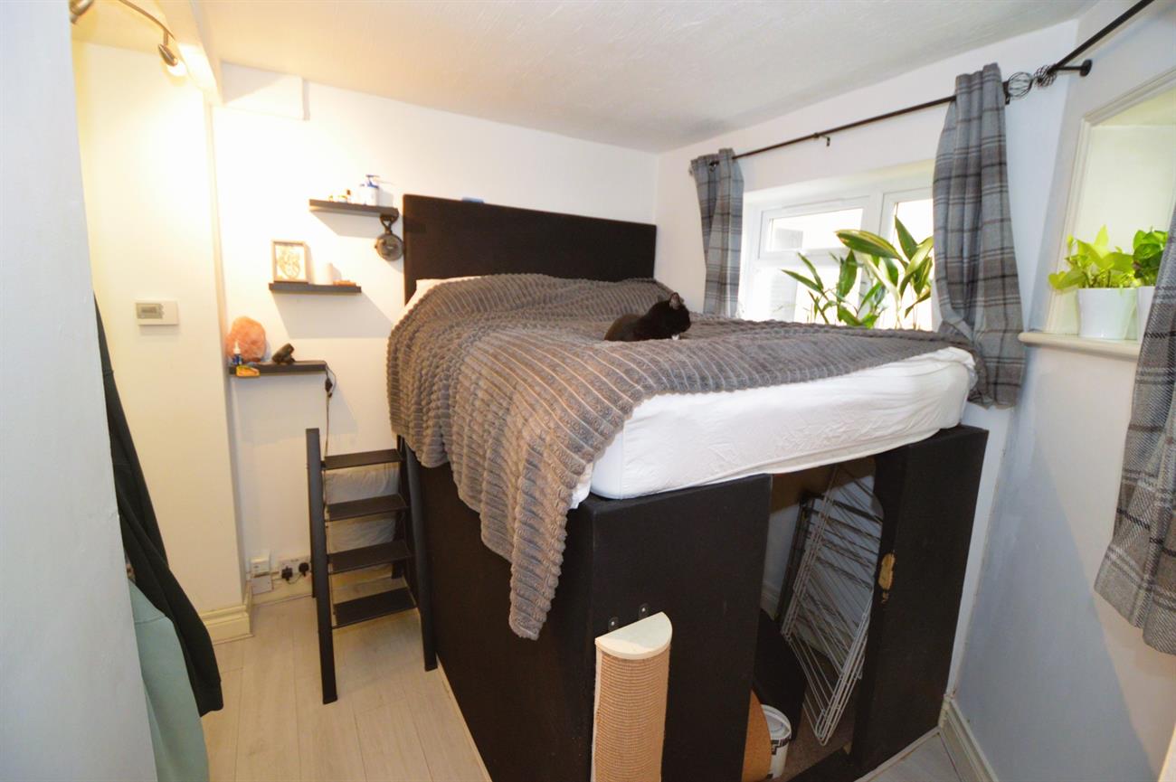 DOUBLE BEDROOM: 9’4 x 7’11 (2.85m x 2.42m). Electric panel heater with a wall mounted programmer, wood laminate flooring, two double glazed windows, large high level Ottoman style bed frame with storage, opening to dressing area/study area with double glazed window and extractor fan.
