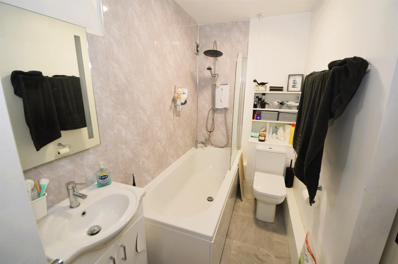 A white suite with panel enclosed bath, shower screen, wall mounted Mira thermostatic shower unit, low level WC, extractor fan, wash basin with vanity unit, vinyl flooring, sliding door to entrance hall. Door from bathroom to;