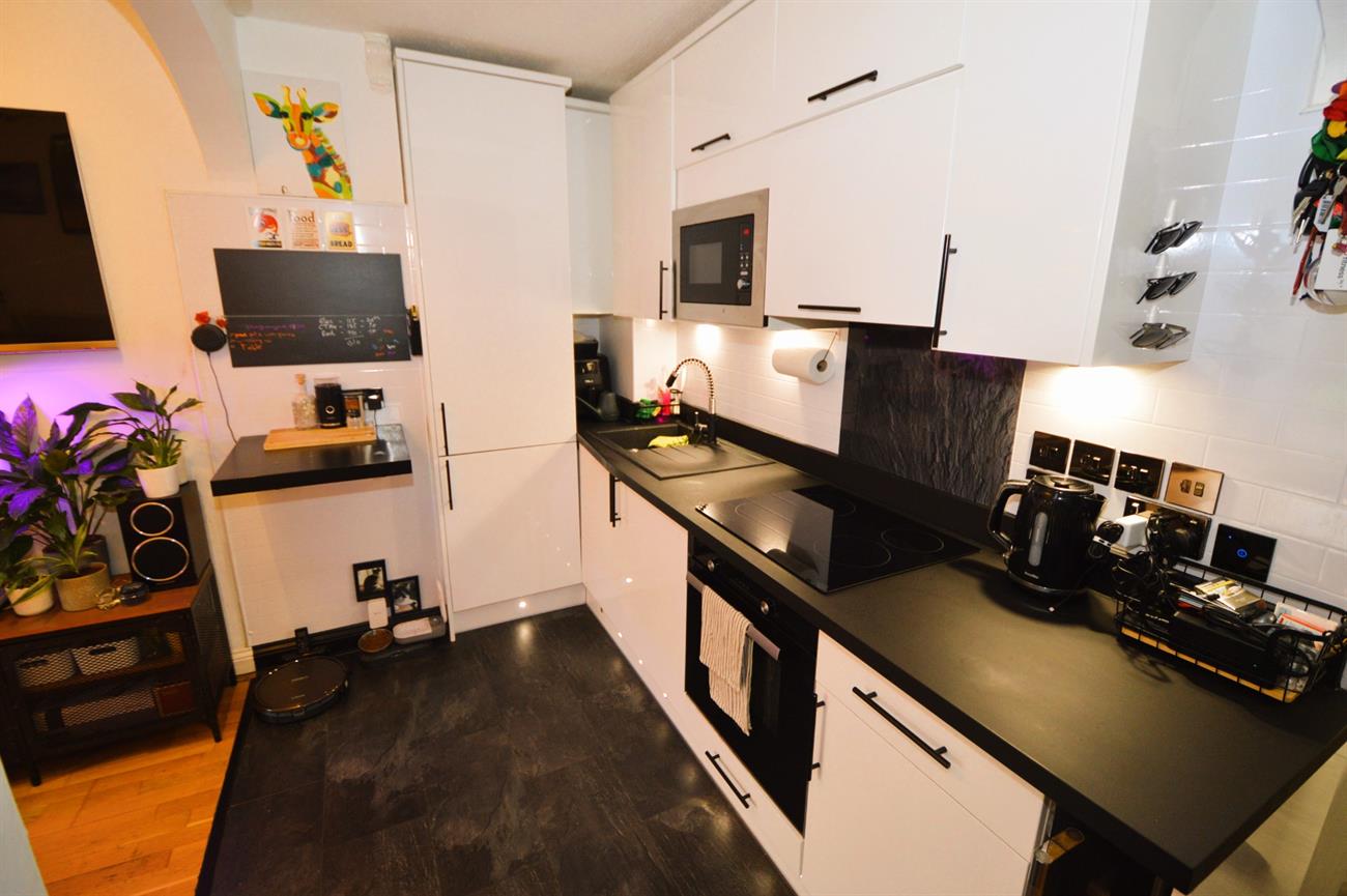 Modern kitchen area: With a range of white base and wall cupboards, tiled splashbacks, cabinet under lights, four ring electric induction hob with cooker hood, built-in oven, integrated Candy washer/dryer, integrated fridge/freezer, wine cooler, spot lights, black laminate flooring.