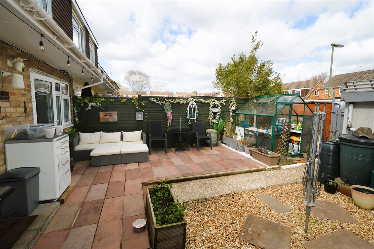 PAVED PATIO STYLE REAR GARDEN: With a wide paved patio and side gravel area, green house, gate to the parking space. Door to: