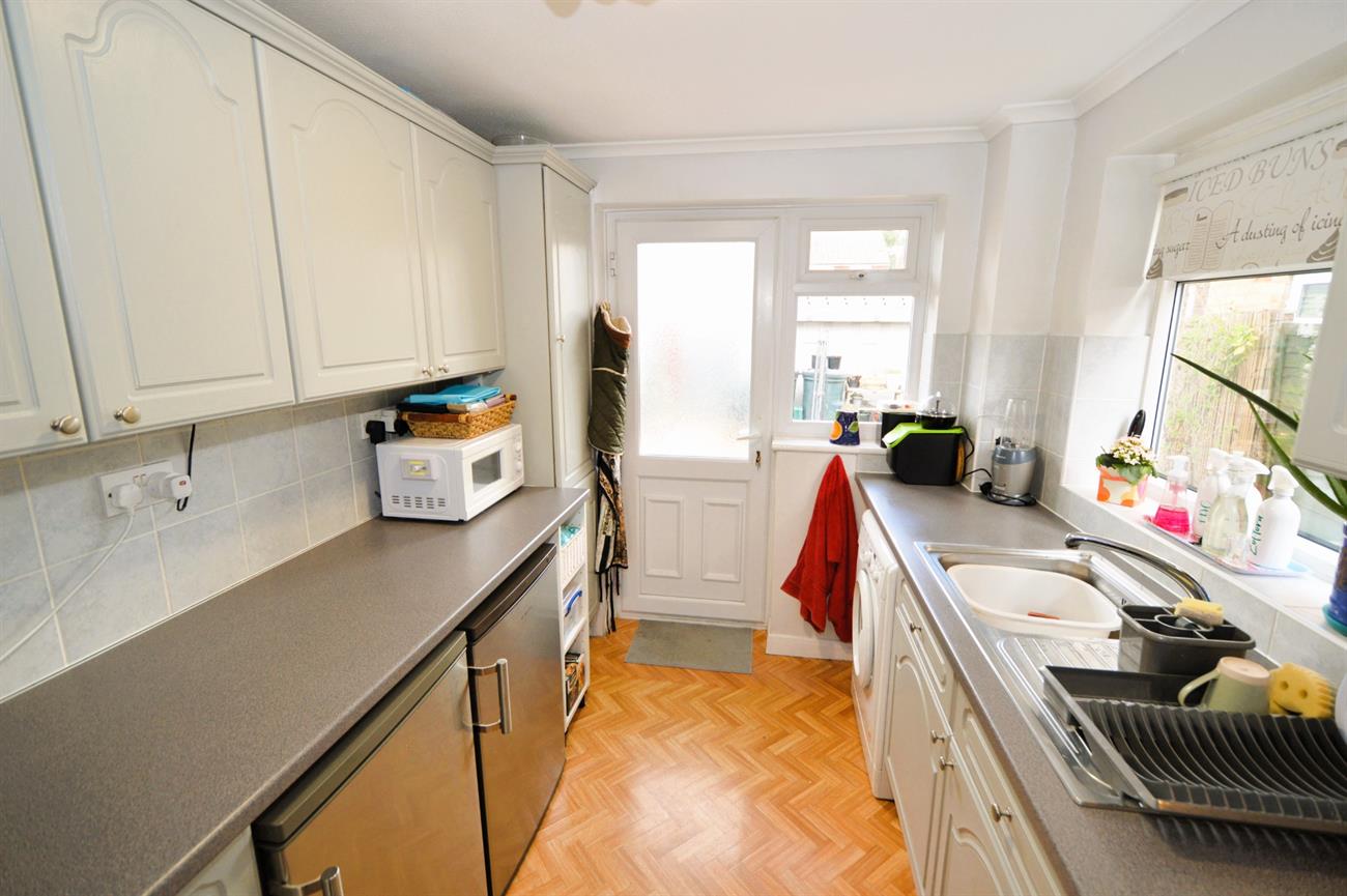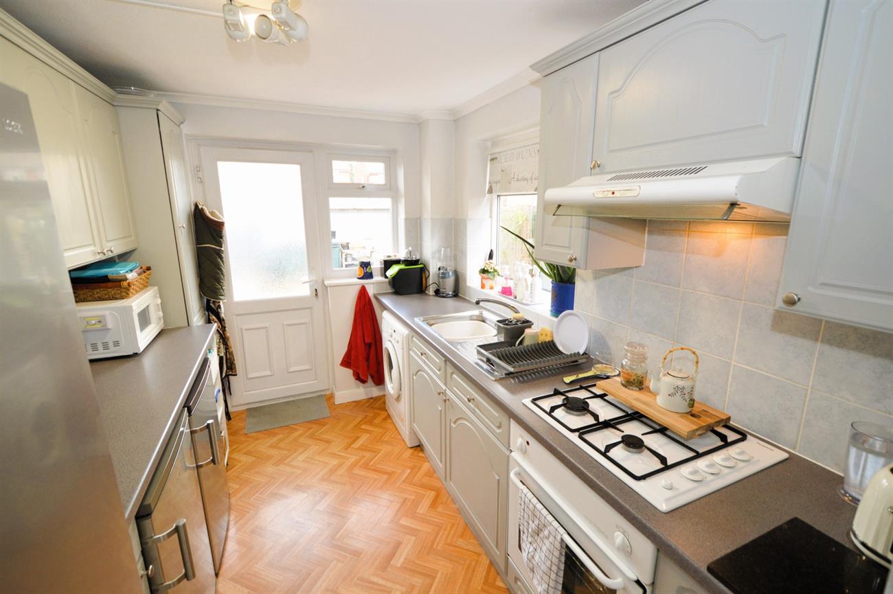 KITCHEN: 10’10 x 7’6 (3.29m x 2.29m). Range of base and wall cupboards with worktops with tiled splash backs, two double glazed windows, rear door, stainless steel sink with mixer tap, built-in oven, four ring gas hob and a cooker hood. Spaces for a washing machine, low level fridge and a freezer.