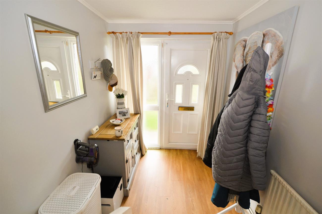 ENTRANCE HALL: Double glazed door and side panel, wood laminate flooring, heating thermostat, under the stairs cupboard with gas and electric meters, fuse box.