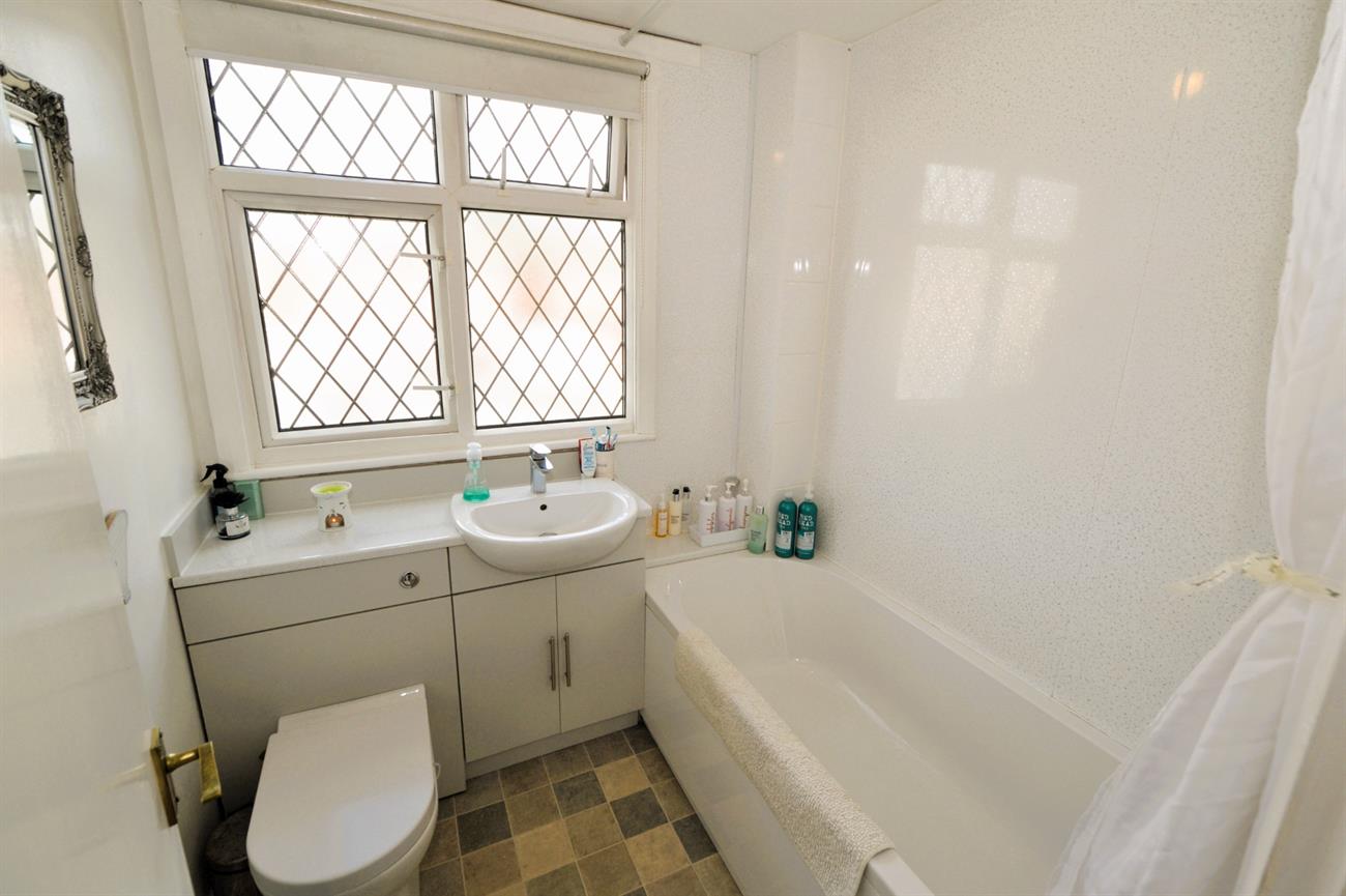 BATHROOM: 6’4 x 6’2 (1.94m x 1.88m). A white suite with panel enclosed bath, wall mounted shower unit, double glazed window, wash hand basin in a vanity unit under, WC, towel radiator, vinyl flooring.