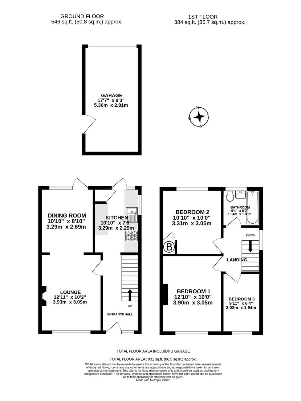 GARAGE: 17’7 x 9’3 (5.36m x 2.81m). Up and over door, power points and lighting. Rear door to garden.