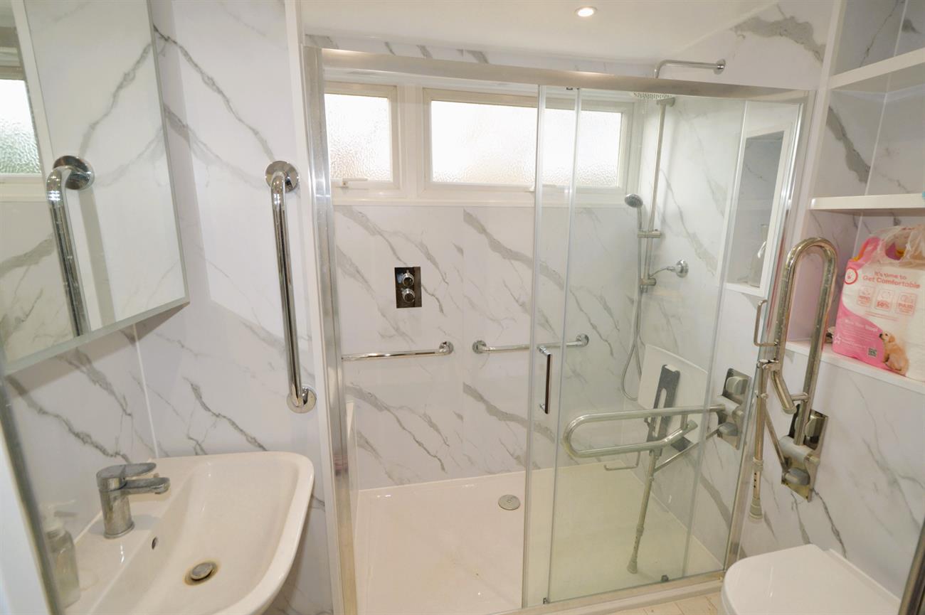 SHOWER ROOM: Formally a bathroom with low level WC, wash hand basin with mixer tap, walk in shower with sliding door, wall mounted shower unit on a riser bar, double glazed window, towel heater, down lights.