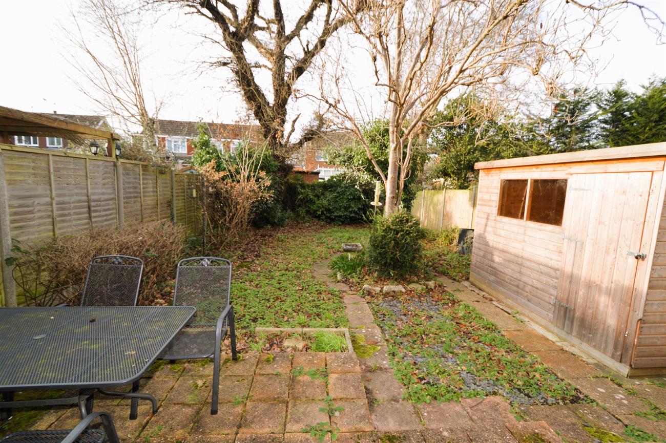 REAR GARDEN: Patio area leading to lawn with shrub borders, garden shed. The garden is in need of attention.