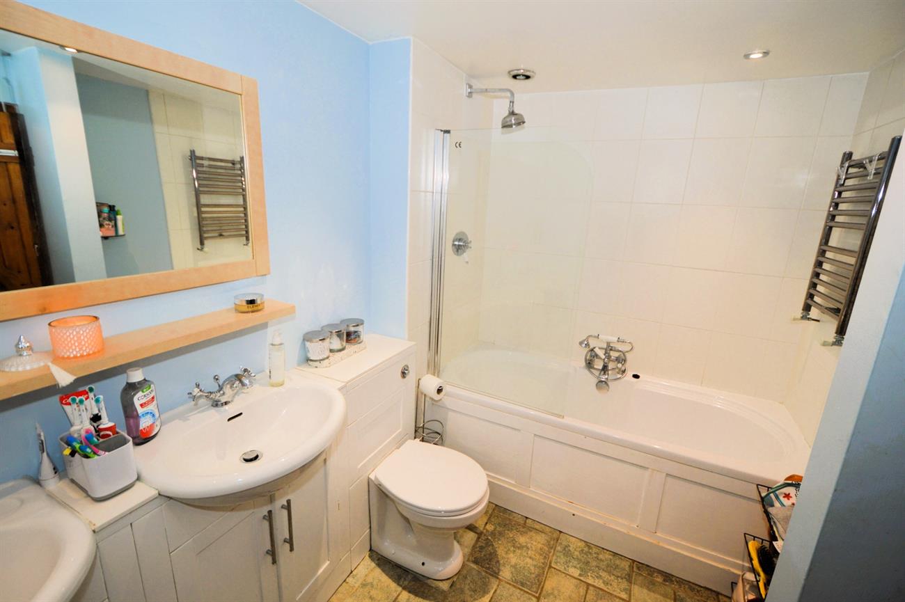 BATHROOM: A white suite with panel enclosed bath, shower screen, low level WC, two wash hand basins with vanity units under, towel radiator, down lighting, roof window, continuation of stone tiled flooring.